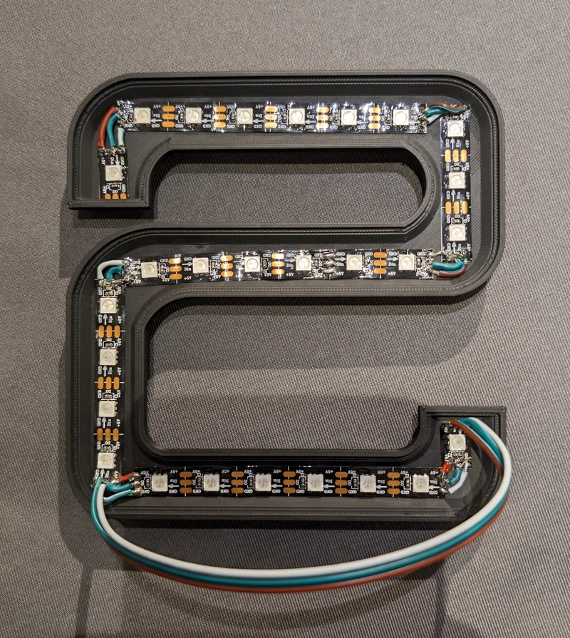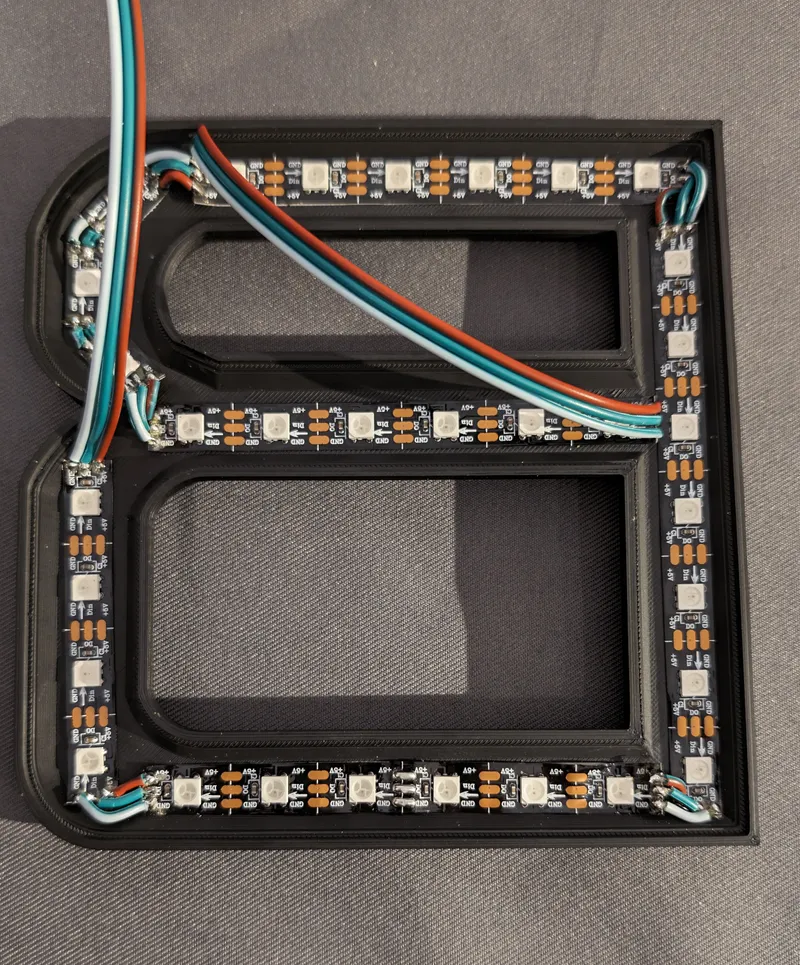 16. Due to the full length of the led strip (in my case 155 LEDs) you should use an external power supply. Wiring all letters in parallel keeps the voltage drop low and you have no brightness drop.