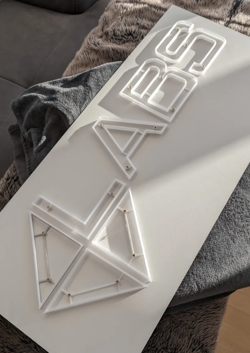 8. The hard part - keep calm: Solder all the letters with the WS2812b LED Strips. Keep attention to the direction of the data steam. Have a look at point 14 first!