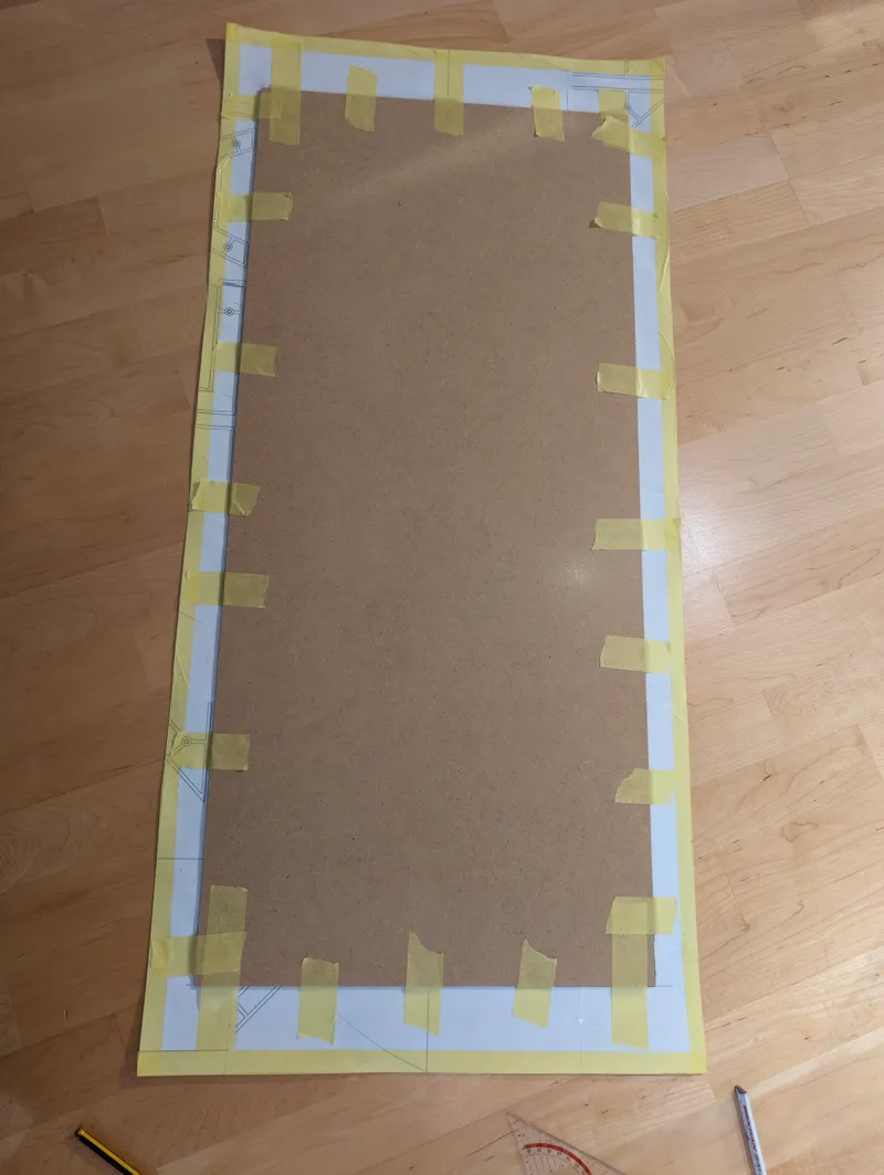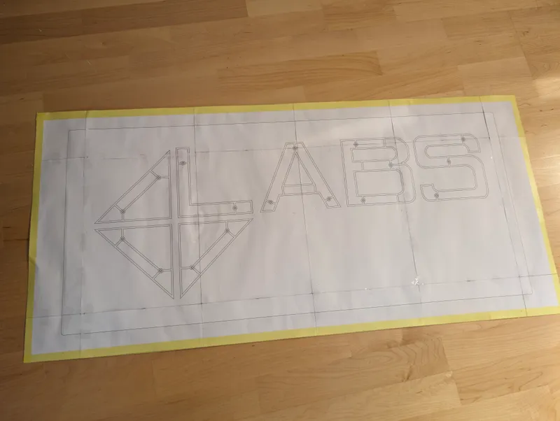 5. Tape the blueprint to the MDF plate centered, so we can drill the holes for the letters