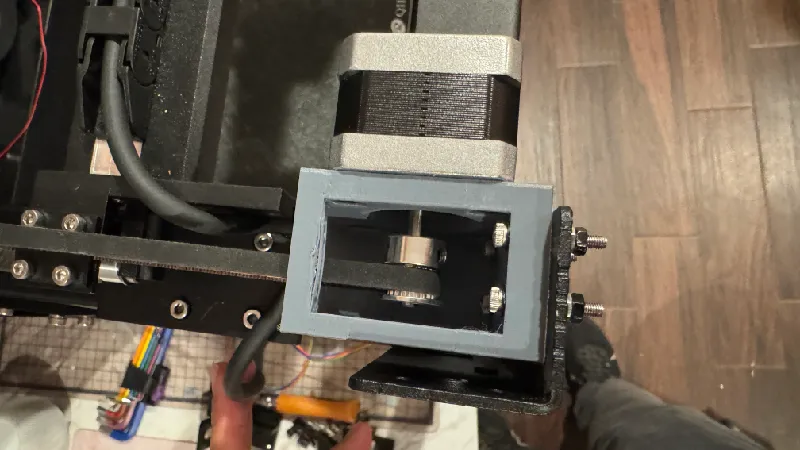 Next, I tried removing the mechanical coupling rod that runs across the front top of the machine which enables the single Y-axis motor to drive both the left and the right belts simultaneously. I figured I had a spare motor left over from another printer and the M8P board had available motor drive ports and Klipper has the ability to dual drive any axis when configuring the firmware correctly. I re-used a stepper motor driver for the Y2 motor, and used the Orbitool's on-board driver for the extruder so I wouldn't have to buy another stepper driver. All I needed was a mount to hold the motor to the frame. Use ABS if you decide to do the same. PAHT will deform from the heat, ABS+GF will crack over time from the mechanical loads. The gray part is symmetric. You will need one for each front motor if performing this part of the upgrade. It is just some M3 hardware and ensuring no belt rubbing on pulleys. I'm not convinced it was necessary. But I'm glad it was done.