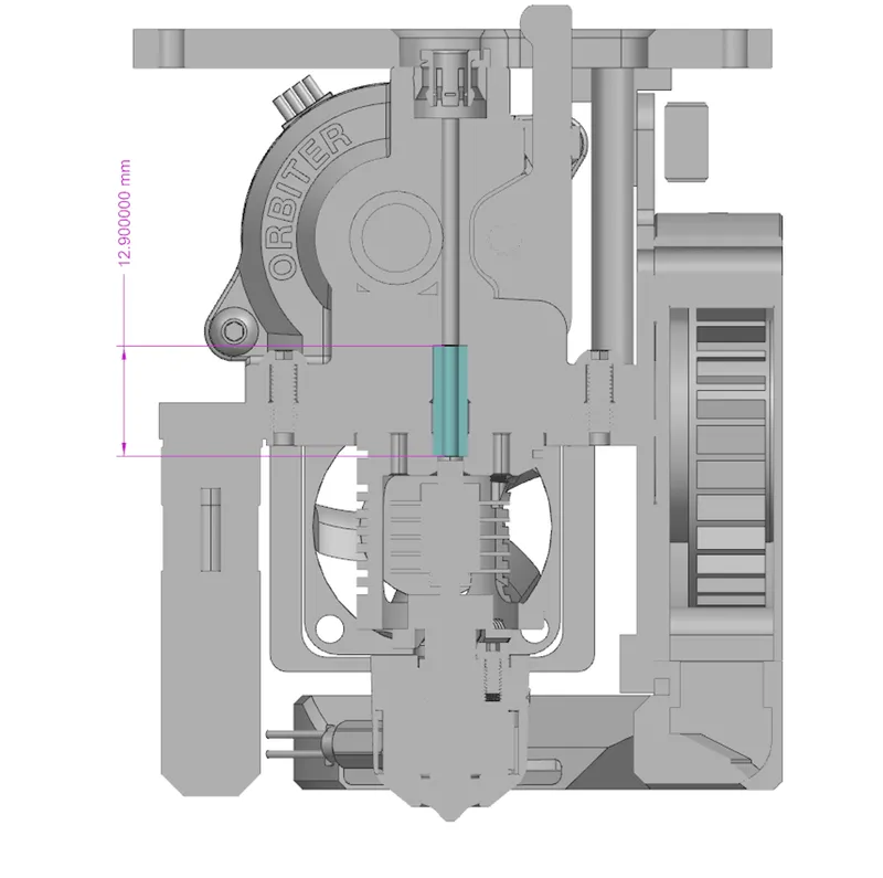 Install a 12.8 mm length teflon tube with OD 4mm & ID 2.0 mm into the throat of the hotend. It should reach the bottom side of the extruder as seen in this cross-section.