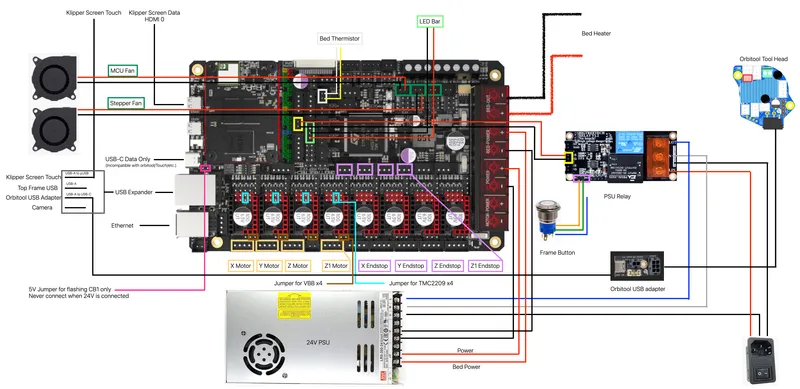 Follow <these instructions> to flash the BTT Relay V1.2 so that it has 30 seconds timeout instead of 10 seconds. The CB1 takes 30s to boot. The relay will constantly power everything down otherwise. You can bypass the OEM power button on the top of the machine entirely by simply attaching a jumper between 5V & GND on the relay. In that way the machine will always receive power and you will need to reach around the back right rear of the machine to toggle the main power switch.