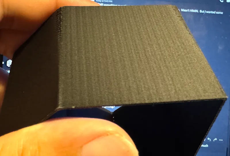Unfortunately, since I took the long route to this solution my machine is now much more upgraded than is likely necessary. I have neither the time nor the desire to remove all the upgrades and test just the removal of the tension spring alone with no other change. But I lay it all out here so you can make your own decisions. I don't run the machine at crazy speeds because good quality is always a delicate balance of cooling, material selection, part geometry, etc. I standardized on 400 mm/s travels, 300 mm/s infills, 200 mm/s outer wall, 9k acceleration for normal printing, 4k acceleration outer wall, and 9k acceleration inner wall. This is the new default, I have Orca profiles that are faster for PLA and ABS or slower for fiber filled hybrids. The speed limitation is always either the hotend with its 24 mm^3/s flow rate, or my derating settings for quality. I found that when installing the hotend extender that comes with the Next G Fiber I can print at 35 mm^3/s flow rate but my retractions aren't as quick. Counter to popular recommendations I run retractions on all my jobs with a z hop equal to my layer height. I find retractions give me much better quality more consistently across geometries and materials. The print quality is as good or better than with the OEM hardware.