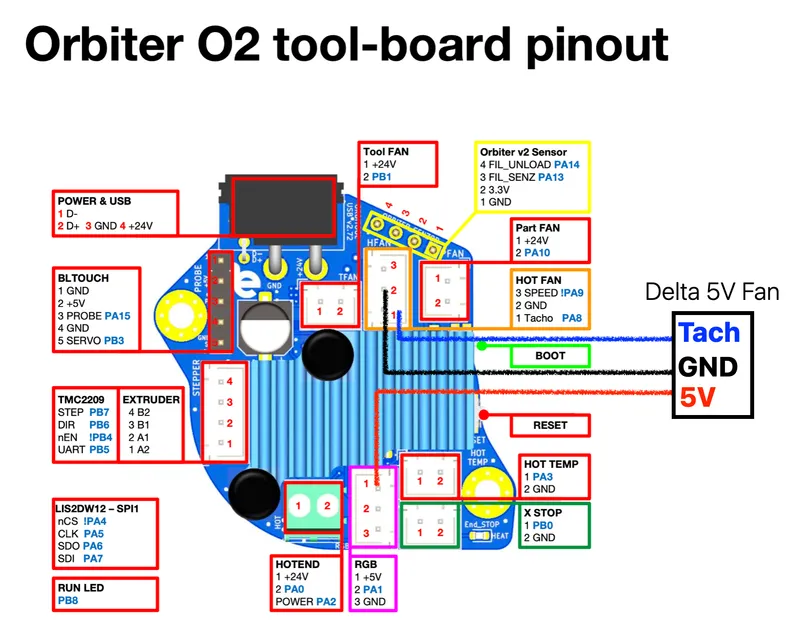 I use the 3-wire Delta fan that runs on 5V (Part number: ASB02505SHA-AY6B) that reliably pushes air at a rate of 4.3 cubic feet per minute while matching the height of the cooling fins on the hotend at 25 mm x 25 mm. Since the Orbitool Toolboard PCB runs on 24V I had to insert my crimped wires into the plastic connectors in a very non-standard way. Here is how I hijack 5V from some pins that were meant to drive LEDs but still use the tachometer monitoring feature on pin PA8. Tachometer monitoring guards against hotend melt downs if the fan were to fail. I only needed that melted plastic mess to ruin my day one time on an earlier printer to learn my lesson. Now my printer stops if the fan RPM drops below 10,000 during a print.