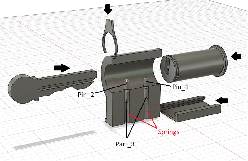 Then insert Pin-1 and Pin-2 into the holes at the bottom of part_1 and then part_3 and the springs.