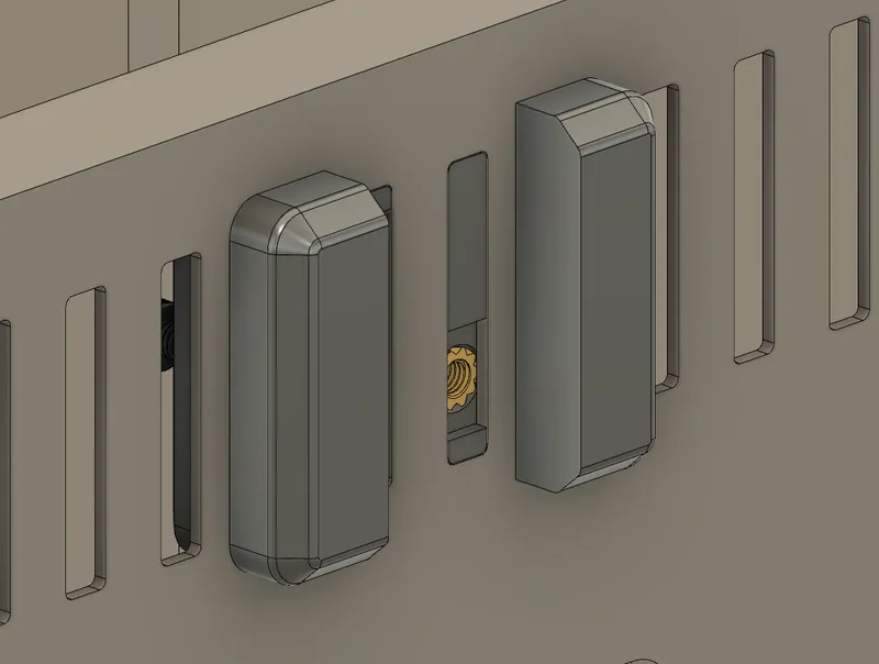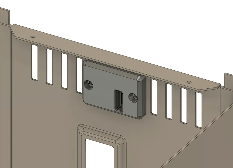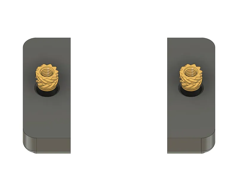 Insert a heatset insert into both “Exterior_Plate_R[ABS].stl” and “Exterior_Plate_L[ABS].stl” as pictured (again making sure they're flush or slightly below the surface of the part).