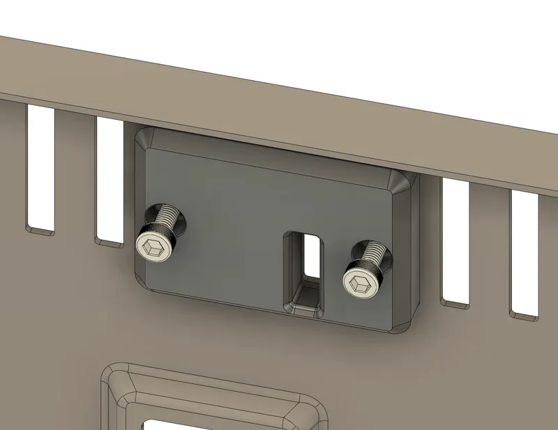Using 2 M3x8mm socket head cap screws, secure both “Exterior_Plate_R[ABS].stl” and “Exterior_Plate_L[ABS].stl” on the outside of the machine, securing “Interior_Plate[ABS].stl” in place by clamping to the metal chassis. Leave the screws slightly loose as there is some designed tolerance for adjustment here.