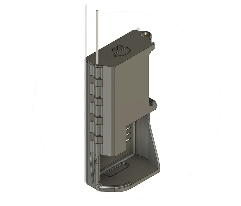 Assemble “PCB_Hinge_Cover[ABS].stl” and “PCB_Housing_Base[ABS].stl” into the closed position and insert the 1.5mm x 80mm rod and press through so that the rod is flush with the top of the housing. Be careful to not bend the rod or damage the 3d prints when inserting.