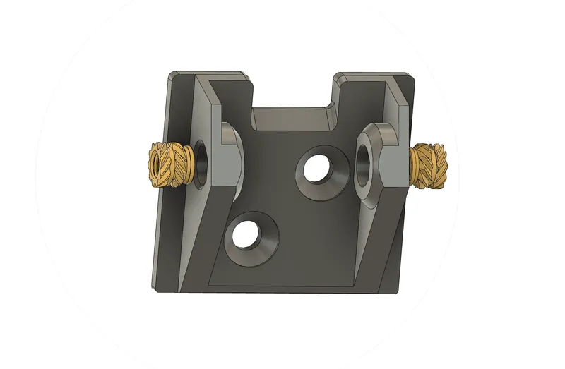 Insert two m3 heatset inserts into “Mount_Fixed_Plate[ABS].stl” as pictured, making sure they are sitting as flush as possible.
