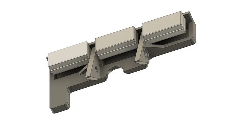Glue 2 20x10x3mm magnets (stacked) into each of the three pockets in “Mount_Front[ABS].stl” as pictured, using either CA glue or epoxy.