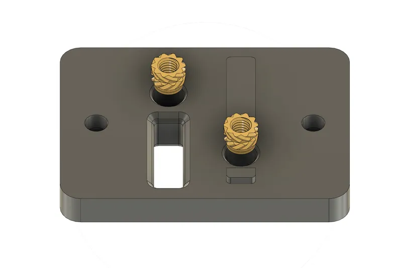 Insert 2 heatset inserts into “Interior_Plate[ABS].stl” as pictured (again making sure they're flush or slightly below the surface of the part).