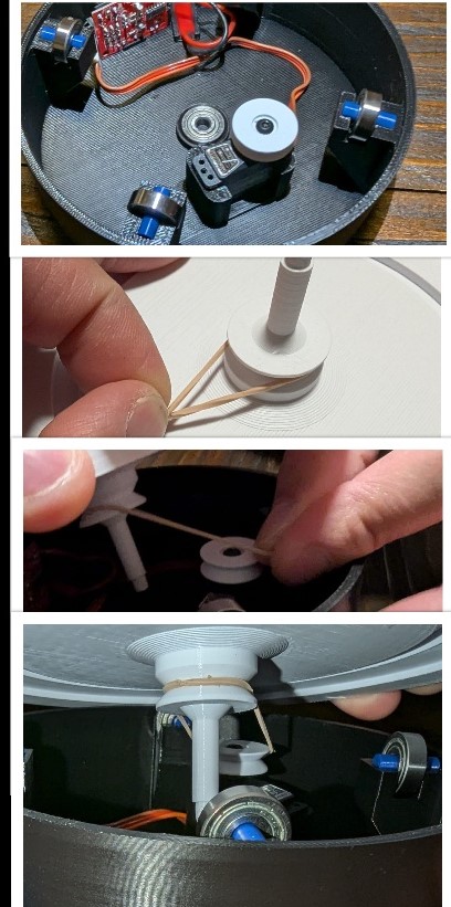 Create a belt off 34.5mm using elastic bands, and loop it around the lid axle. Insert the servo wheel into the belt.