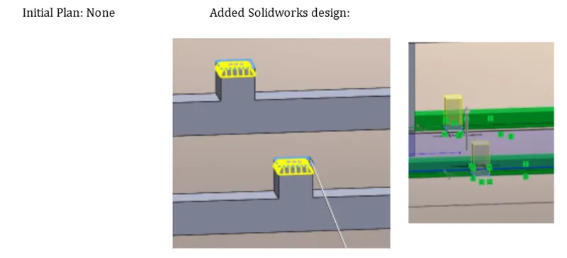 Explanation: Our initial sketch for the bench press didn’t include too much forethought regarding the phone holding cut, so this feature was added during the Solidworks modeling process. Because we opted for a massive cut through the bench, I thought it may help to have these nubs as an extra way to keep phones propped up, in case their dimensions wouldn’t fit the first holding method. I also added a fillet to make it look nicer and less sharp.