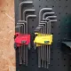 A set of two Wera allen key/hex key set holder adaptors compatible with 1"/25mm pegboard. The smaller [holder] works with 9-piece hex key sets and the larger one works with 13-piece hex key sets.