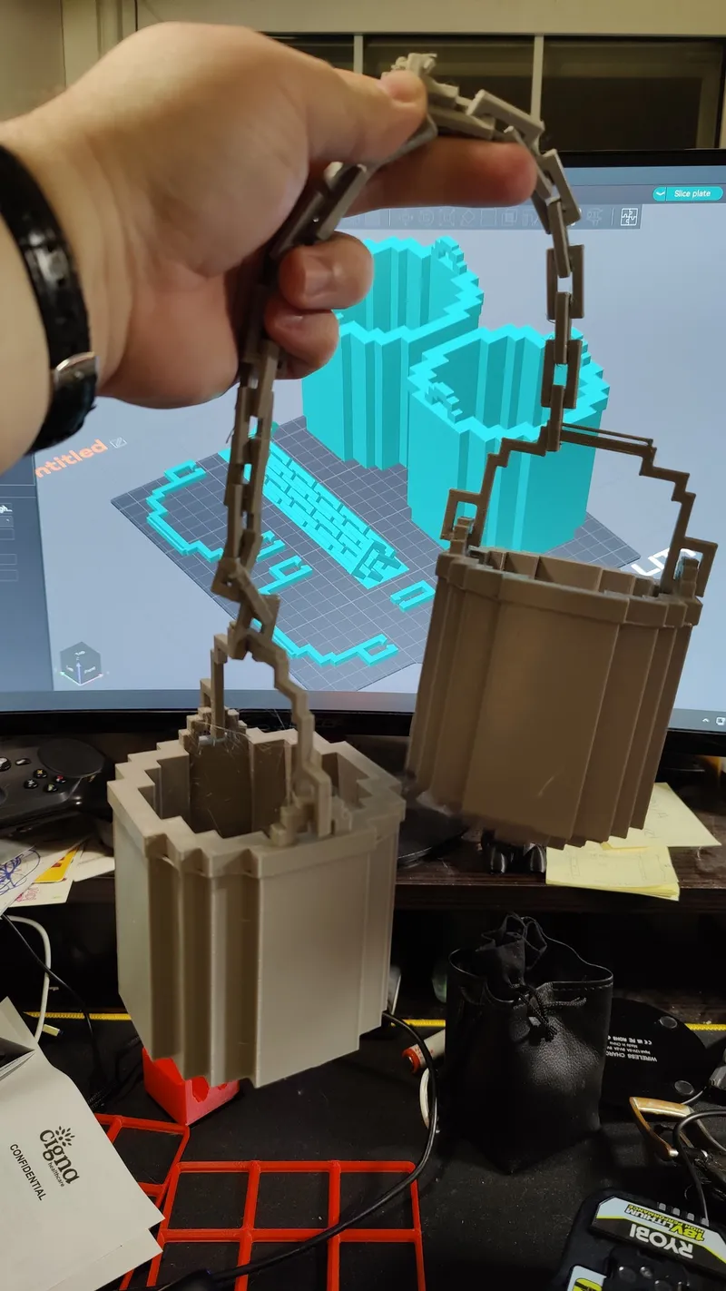 The buckets were fine, the handles came out better than expected, but the linked chain printed like crap, especially where I had to put a link at a weird angle to make a turn. I wasn't about to share a design that, in a sugar-energized child's hands, could become an accidental projectile. So after some iteration and “swing testing”, I came up with the design I've posted here.