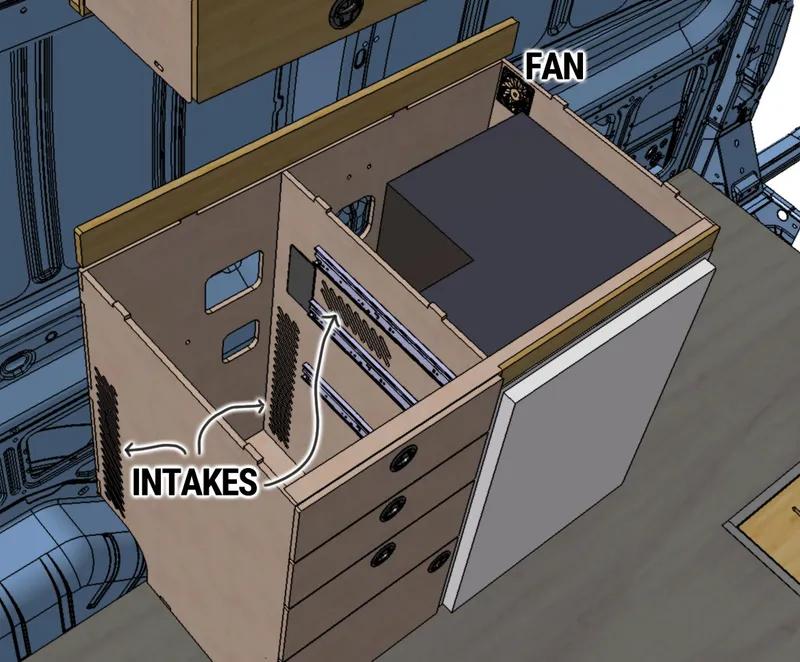 This will be incorporated in the fridge's cabinet in my van. The goal is to force the cool air to go over the fridge's coil and compressor, and exhaust on top with the fan. There are a few inches gap behind and on top of the fridge (hard to see below):