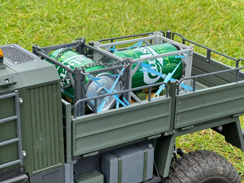 This silly little part takes one beer can (and also other beverages too of course) in order to be hauled around with your RC truck. It fits nicely in top of a 1/10 scale euro pallet. The crates are stackable.
