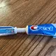 Joins a Crest toothpaste tube to a Crest toothpaste tube.