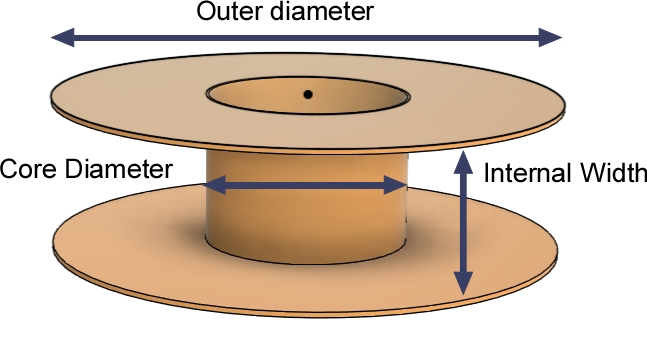 An empty filament spool with an internal width and core diameter that is in the following list: