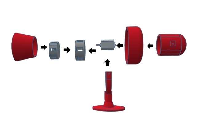 First, glue the motor to the stator. Then attach the chopper to the motor shaft. Now attach the intake to the stator. Caution! The chopper must not touch anything! Now attach the projector to the stator. Now attach the cables to the motor and pull these cables through the two holes in the motor cover. Finally, screw two M3X16 screws into the stand. Place the siren in the stand and screw the two screws together. The screws do not require nuts. The tighter you tighten the screws, the more difficult it will be to move the siren. So if you want to mount the siren, I recommend tightening the screws very tightly.