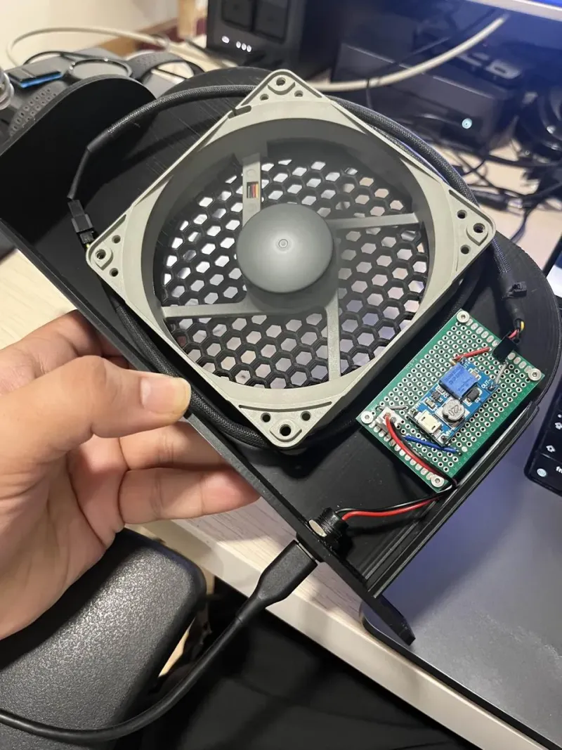 A 120mm fan mount for 19-inch rack systems with mounting space for electronics and a female USB type C plug.