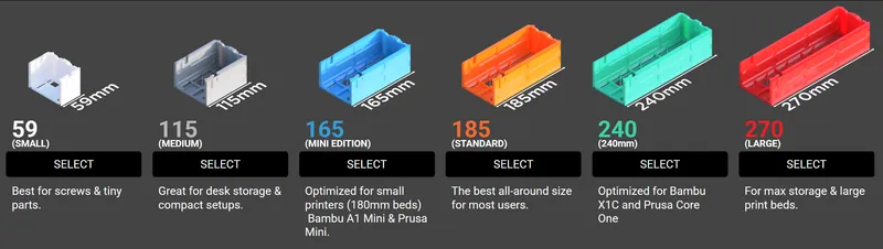 The 185 Collection offers decent storage volume while also maintaining compatibility with the widest range of 3D printers. Find all compatible 185 collection models here HERE