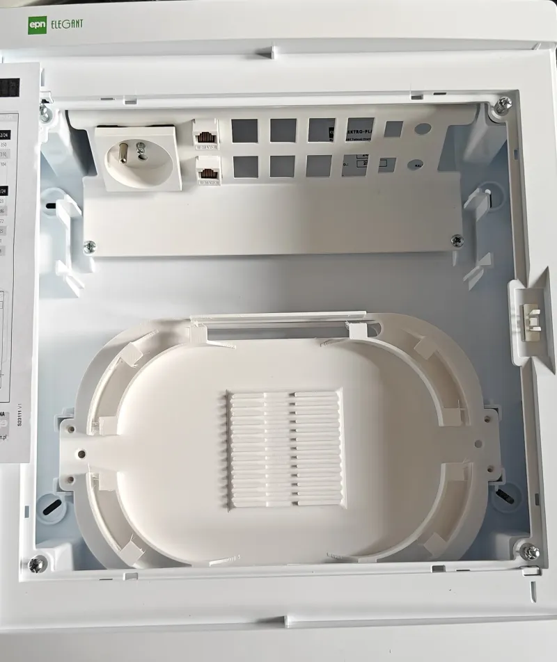 In the upper part, thin bridges are provided (no print supports needed!) at the horizontal elements, with a thickness of 1 layer, which can be very easily removed with a knife after printing, leaving only the thicker part which will stabilize the loops of excess fibers wound aroundIt allows for the placement of fiber optic loops, pigtail splices with appropriate connectors, and hiding them
