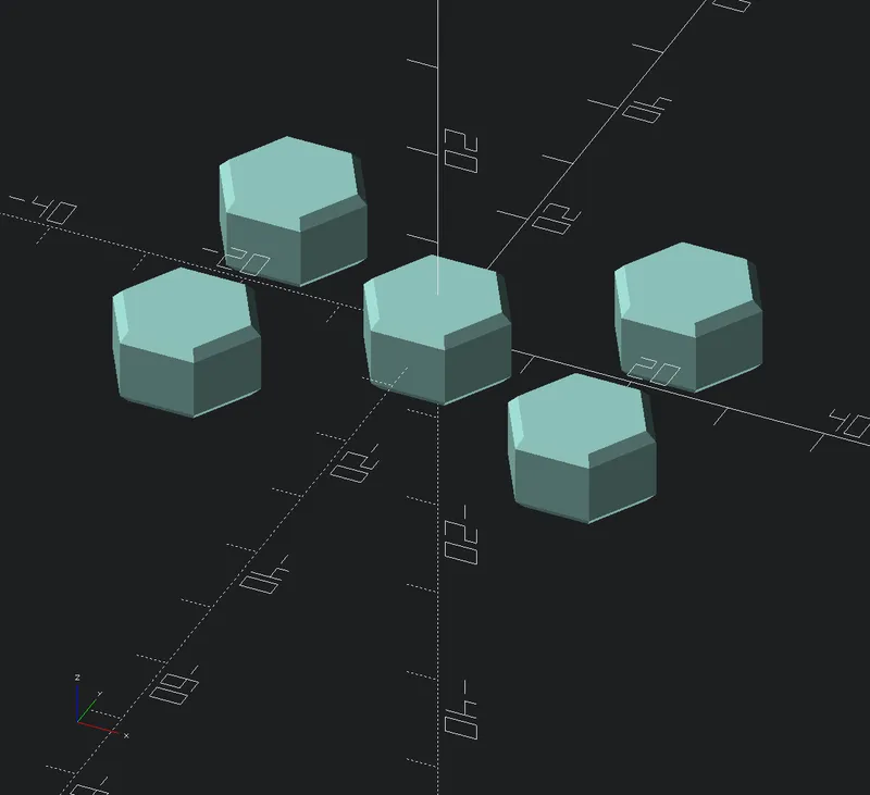 hex_diameter: diameter of the attachment. Default: 15.2. Range: [15.0:0.1:16.0]length: length of the attachment (on Z axis). Default: 8. Range: [7:0.1:200]chamfer: chamfer on top and bottom of the attachment. Default: 1. Range: [7.5:0.01:8.0]size_x: size [mm] of grid X axis size_y: size [mm] of grid Y axiscount_x: size (number of attachment) of grid X axis count_y: size (number of attachment) of grid Y axis Add attachments to model use <BOSL2/std.scad>