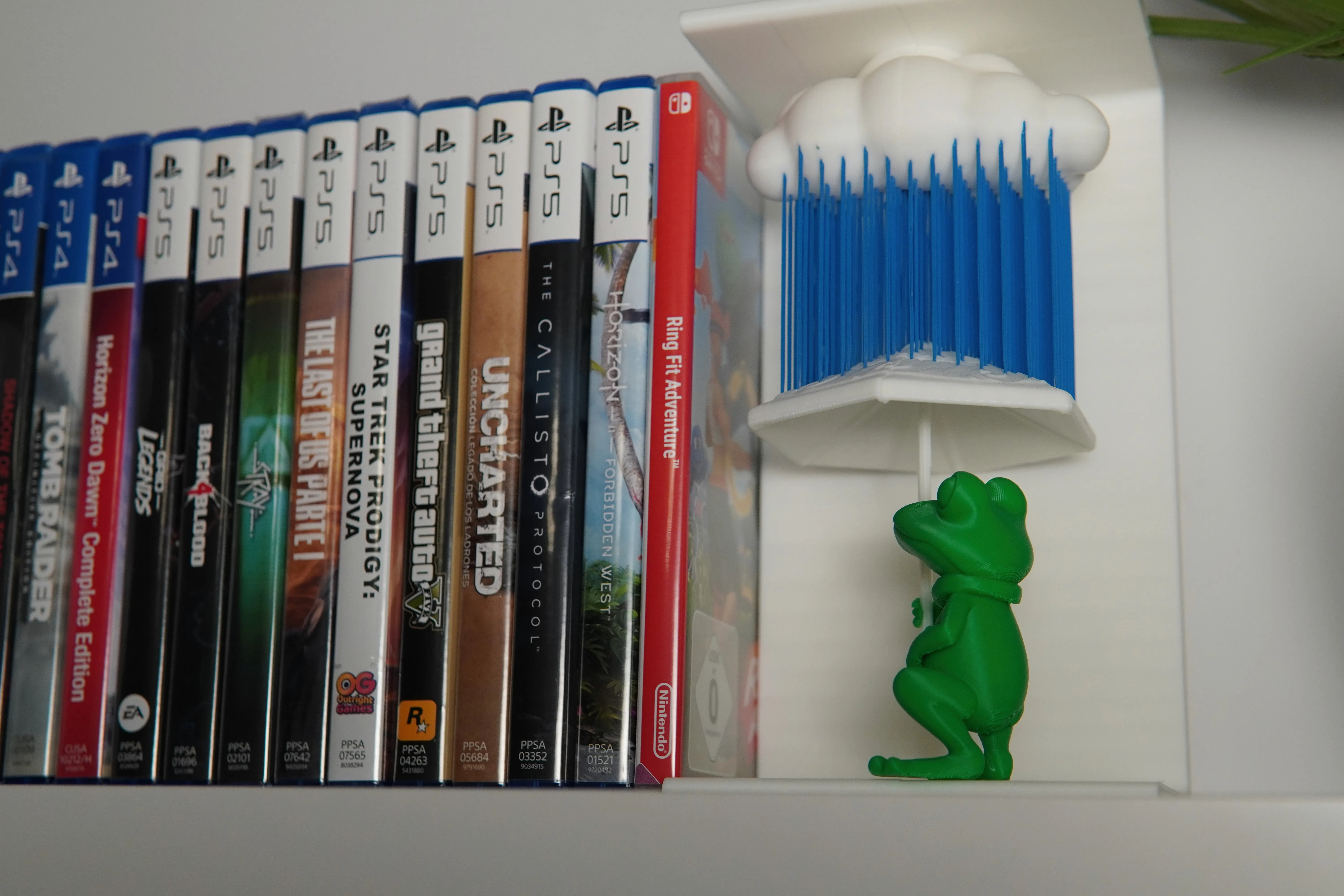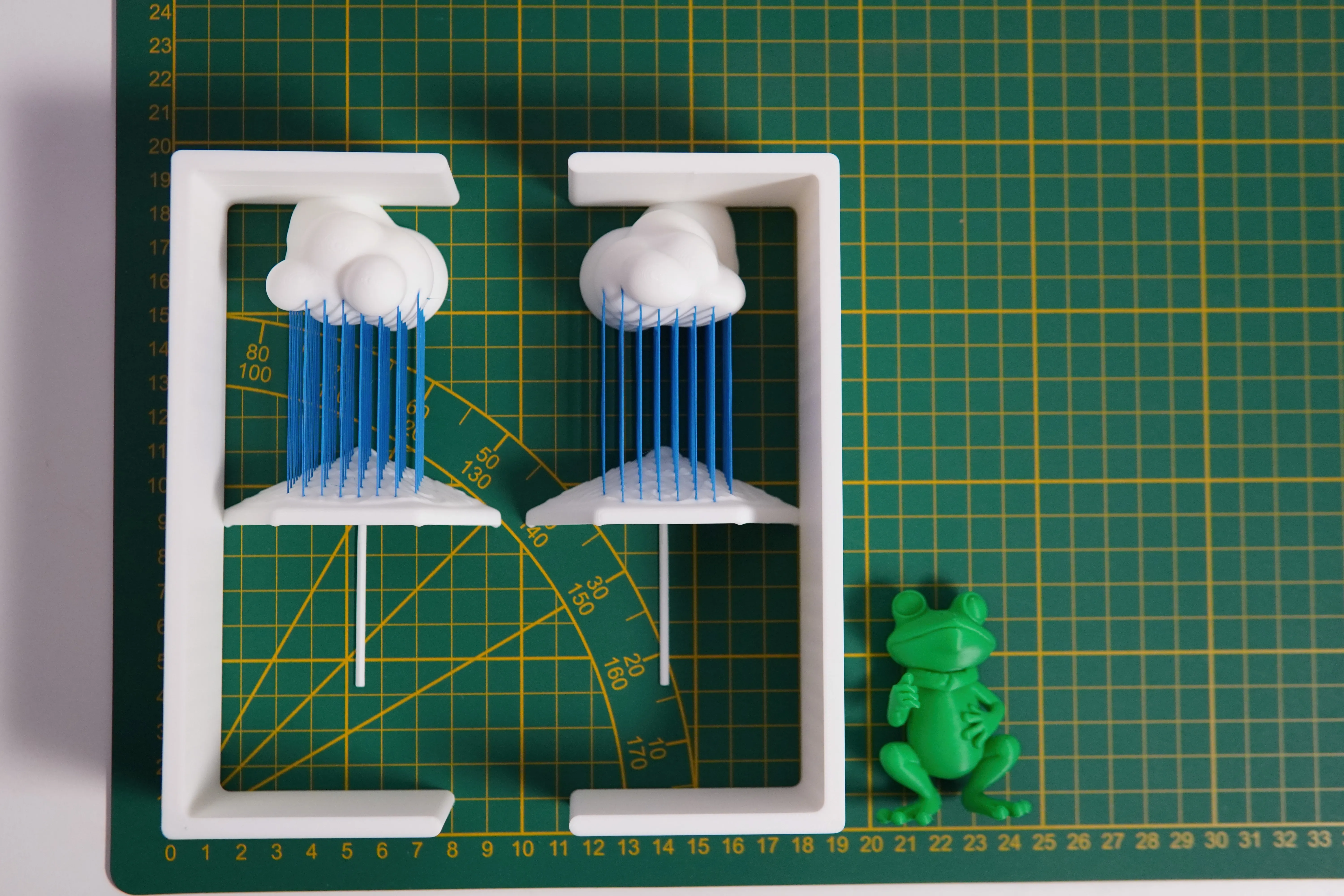 A silly frog who doesnt want to get wet. The frog is printed separately and later inserted into the scene. If you cant get the handle of the umbrella inside the hand, simply dip the hand in hot water and open it a little bit.