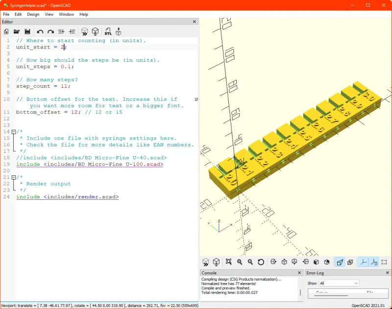 You can download the files from the git repository and open the SyringeHelper.scad file in OpenScad (you need the includes folder too). OpenScad is free software that allows you to make a 3D model by programming. It might be a bit daunting to start with, but if you use a supported syringe, it boils down to changing 3 or 4 variables.