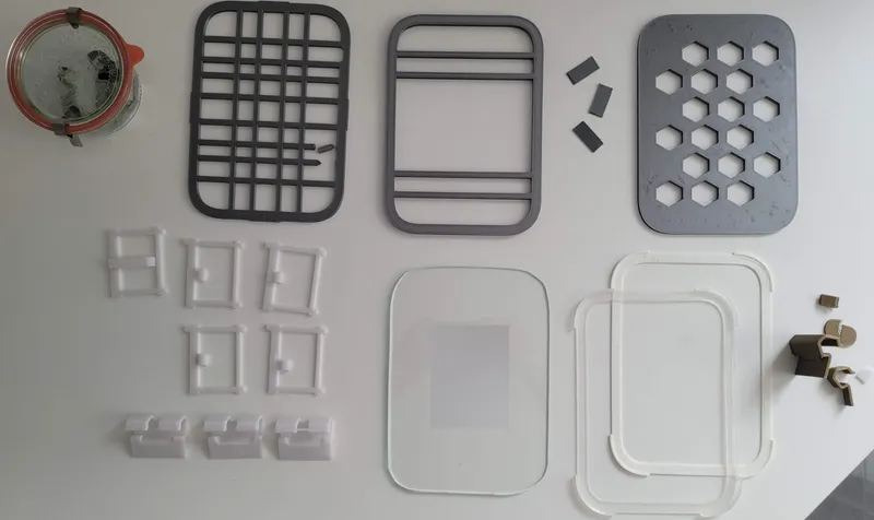 4.) 3D printed 6x “Clamp” with 6x “Clips for Clamps" and 1x “Clamp Lid”. optionally you can print 2x “Alignment helper” if you have trouble aligning all the layers. You also need to print 1x “Mold”. It's about 10% smaller to get a better seal.