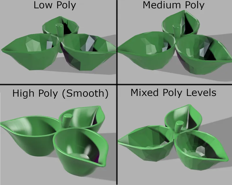 A cute little set of three connected bowls modeled after the shape of a leaf. Three different styles are available at three different poly levels, plus a “mixed” version that intriguingly showcases all three levels simultaneously (which is the version shown in the pictures).