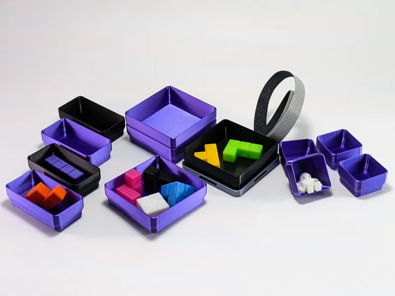 You don't need to print or use the smallest 1 x 1 squares if you don't need tiny storage. I found that the 2 x 2 trays are the perfect size for most of my needs. Everything stacks together and secures nicely with a lid. The lids can be fixed to the trays with Velcro straps in multiple configurations; one strap around the whole tower, two straps crossed perpendicularly, and even secure a lid on top and bottom with two to four straps around the sides.