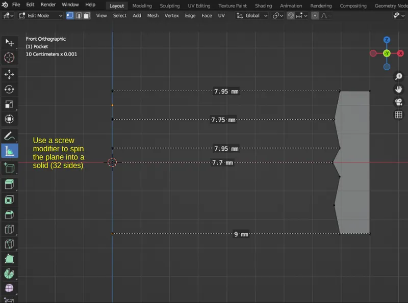 A note on Blender and designing 3d parts. It's not great. But it's not really made to do this, as far as I can tell. Vertex's get added in weird unpredictable places, the dimensions wind up not being accurate for vertex to vertex measurements, tons of open faces get made somehow. This presumably all due to the function of the screw and boolean modifiers. It's weird and unsettling - I stressed over this for a long time before just relaxing into it and making parts with sometimes none, but often a TON of design errors. Turns out PrusaSlicer fixes most all of them. Keep that in mind when looking at the dimensions of each of the Blender pics below.