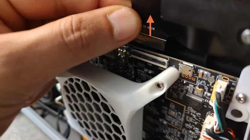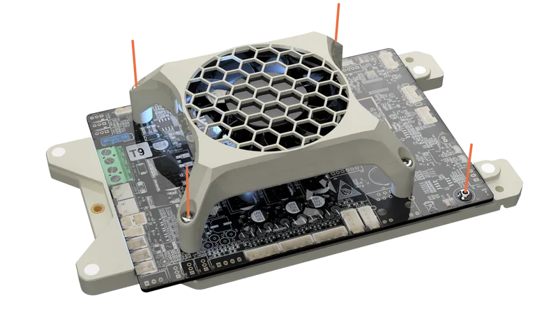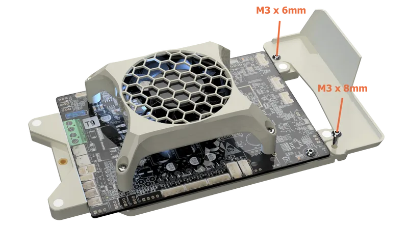 - Place the motherboard and secure it with the fan mount (3 M3 x 18mm screws from the fan) + 1 M3 x 6mm for the remaining hole (previously on the motherboard).