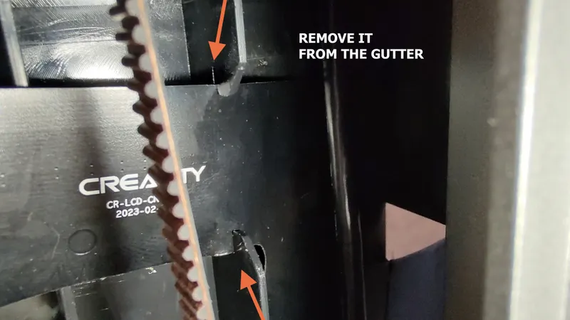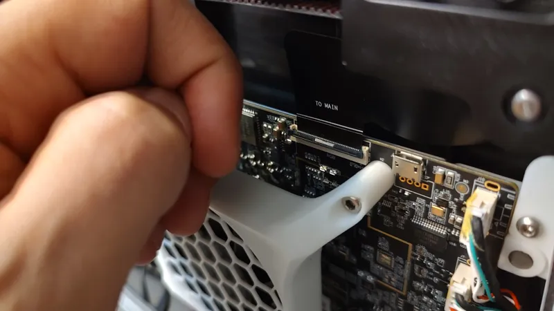 - Plug the ribbon cable to the motherboard and place the other end inside the exit hole without channeling it inside the gutter. Place it between the gutter and the belt.