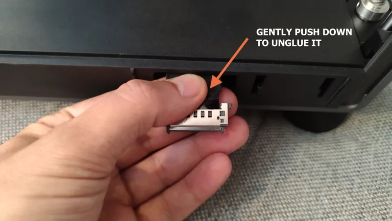 - Now the tricky part. You need to unglue the ribbon cable from the the plastic casing and remove it completely. Be careful, it's fragile and it's locked in place in a gutter, be gentle.