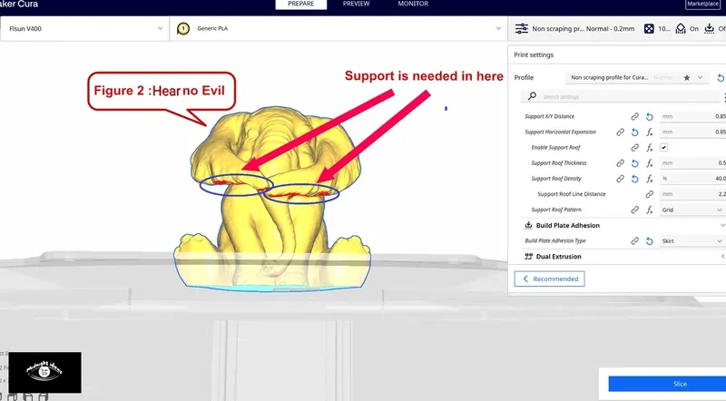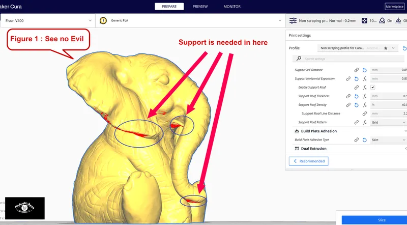 You will need support under the mouth, the right ear and under the trunk. (As shown in the photo). Don't forget to use support blocker for other areas.