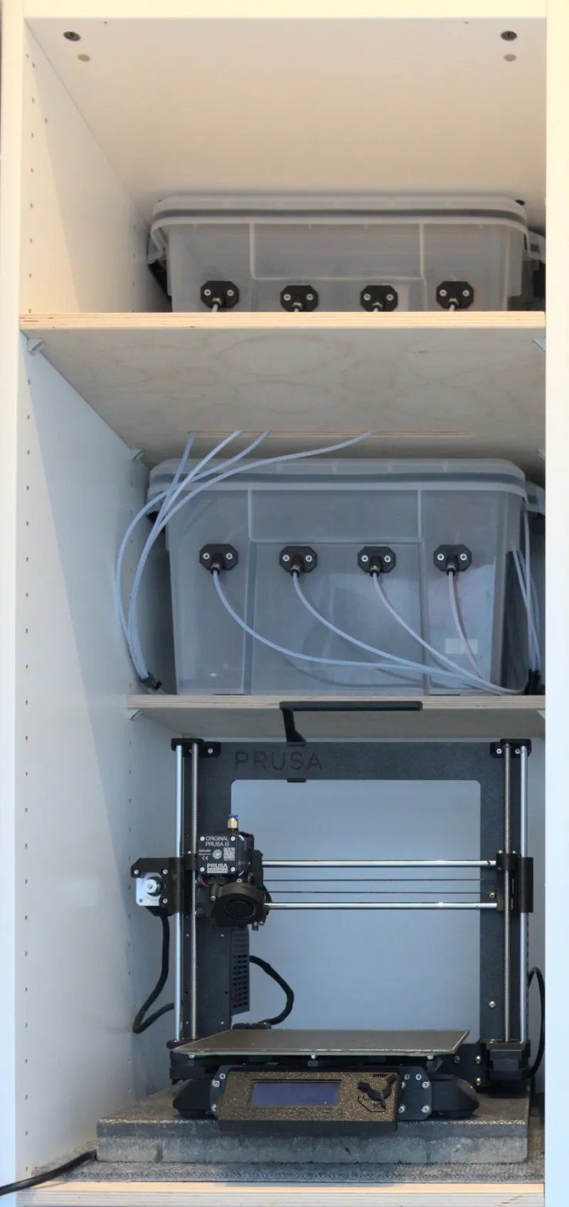 In my setup the boxes are placed above the printer (picture 4 and 5) with the PTFE tubes being guided though an outlet in the shelf board which allows me to directly access the filament of all three boxes for printing.