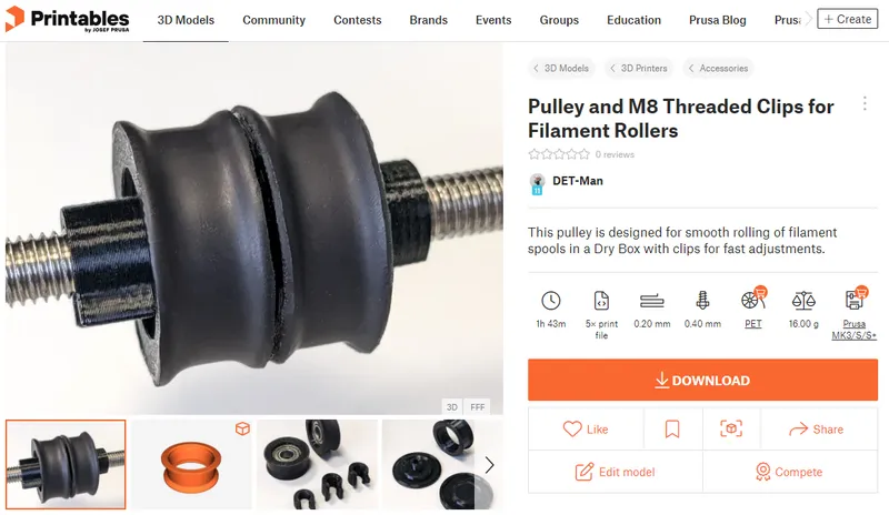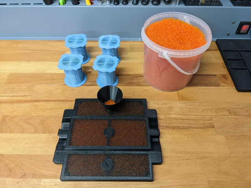 Also you most probably want to print additional Silica containers that go into the center of the filament spool. This will allow you to keep the air in the box dry for a longer time, easily replace some Silica gel when changing a filament spool, and also it will add weight to the filament spool which makes it roll even more robust on the pulleys (especially if the spool is almost empty). The ones which I used for in this project are Filament Spool Desiccant Canister.