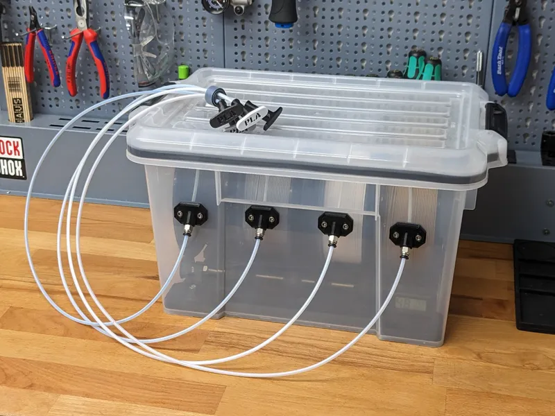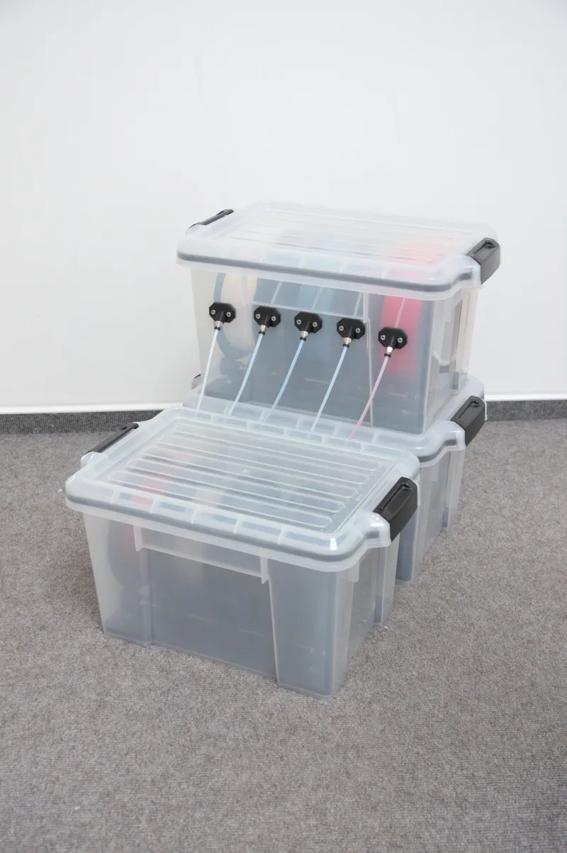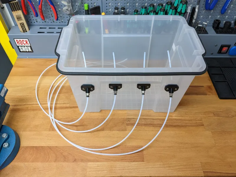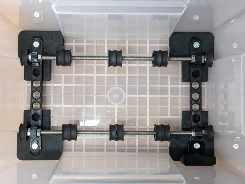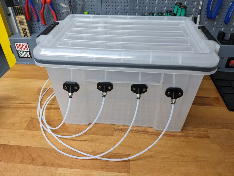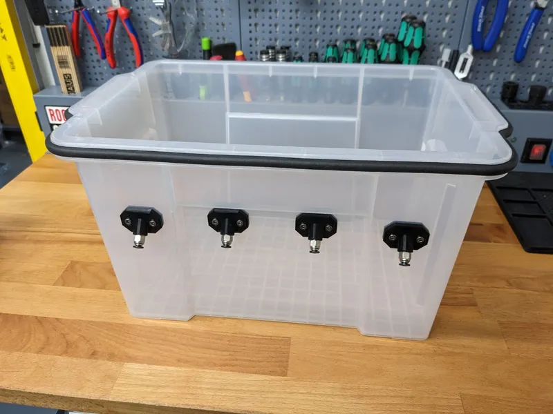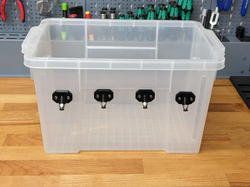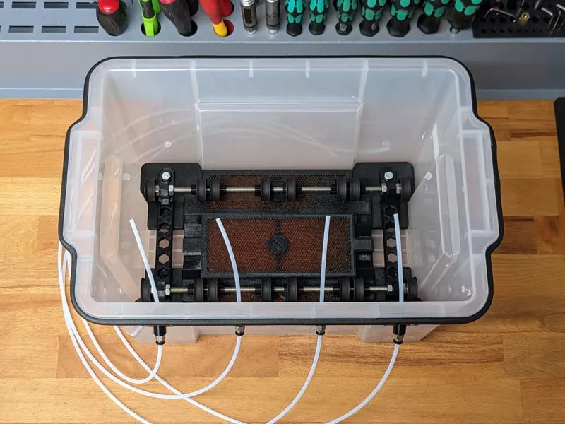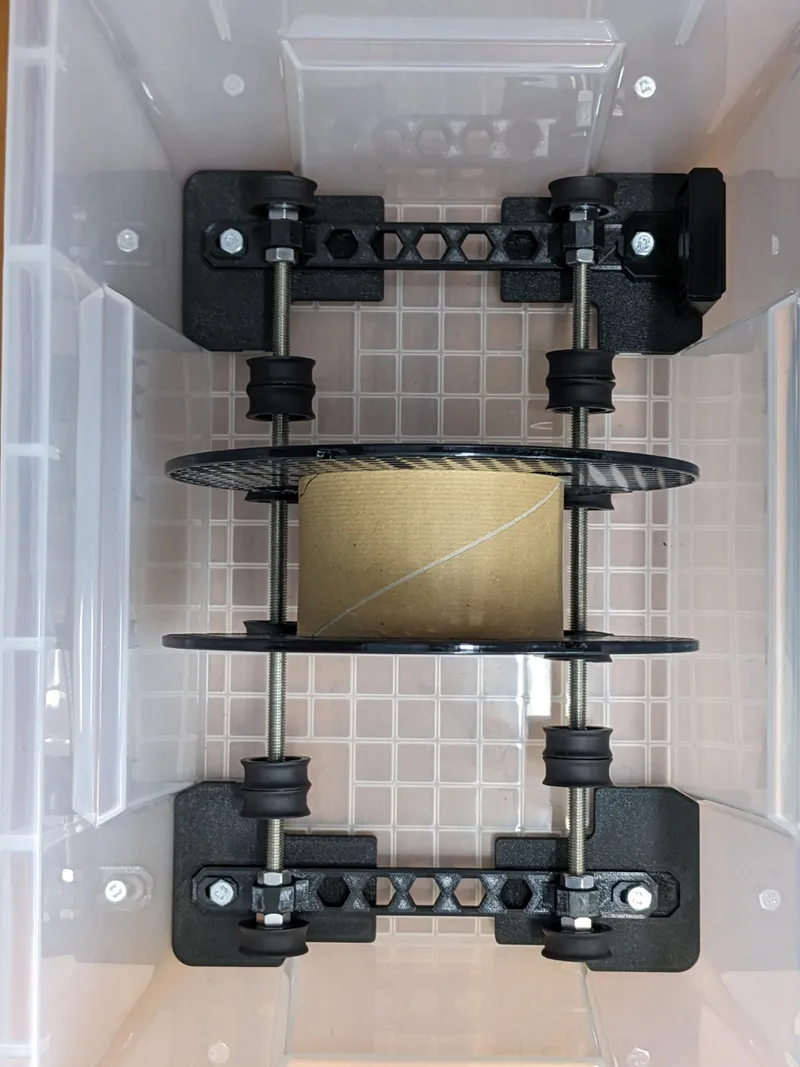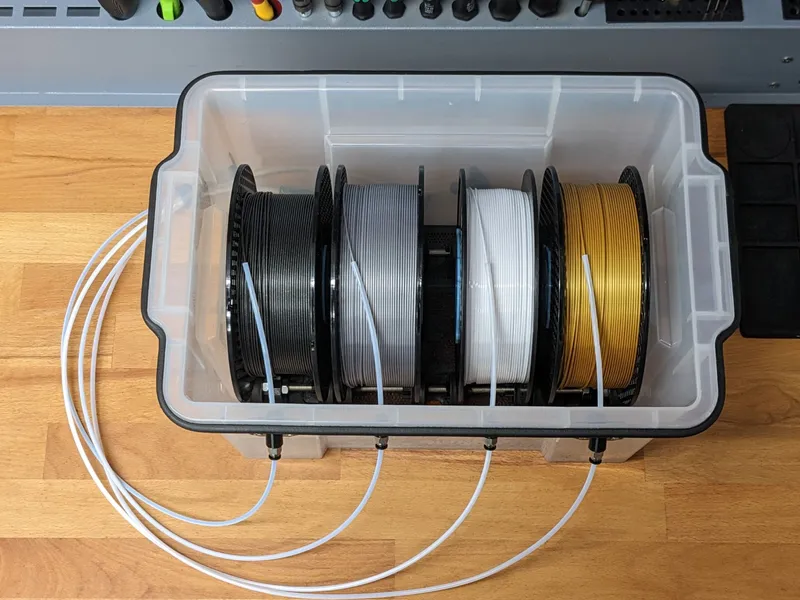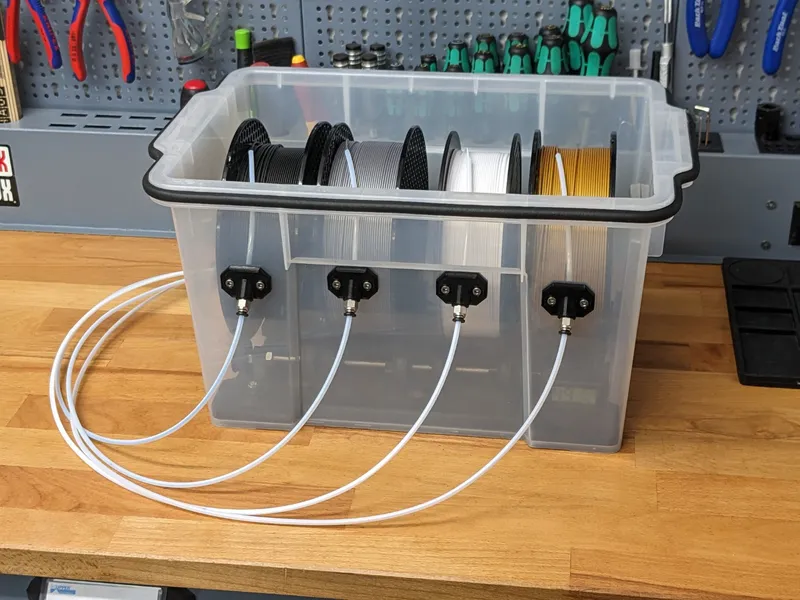 I was looking for a storage solution for my filament, but the popular designs I found weren't right for me in terms of size or didn't meet all of my needs. I finally found some storage containers on Amazon (see parts list below) with perfect outer dimensions, so I started designing the necessary parts to turn it into a new drybox design.