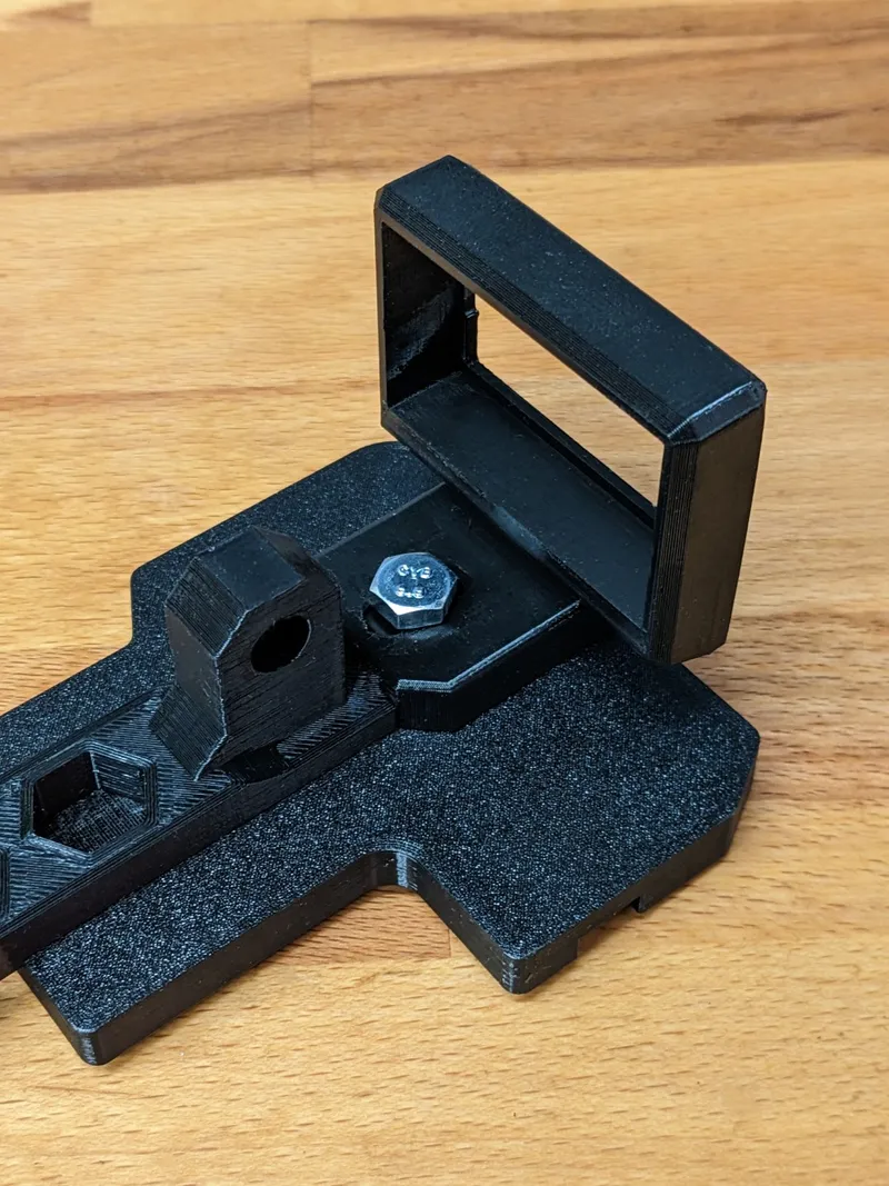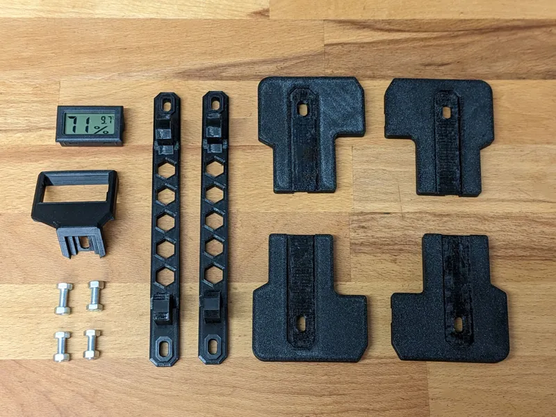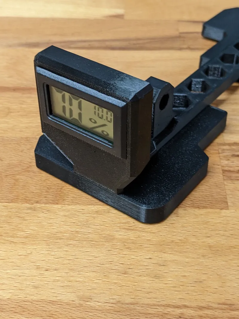 Hygrometer Mount: This part can be mounted on the right bracket (as it is not symmetrical; if you want it on the left side, just mirror it in the slicer). To have it inside the box definitely isn't the best option in terms of readability but I opted for this as it works for me and I wanted to avoid cutting to many holes in the box. If this is a concern for you, you can find several mounting options for this hygrometer that fit right into the box's wall. Print orientation: Place it with the front-facing side on the printbed Supports: None Perimeters: 3 Infill: 15 % Required Quantity: 1