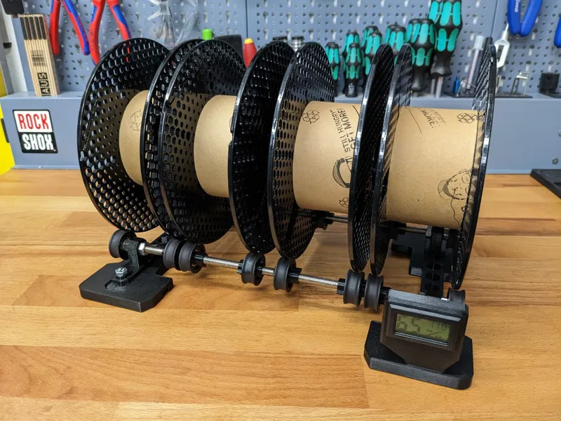 Optionally fill the containers which go into the center of the spool. The additional weight will help the spool to roll while the filament gets less and the spool lighter over time. Especially if you use Prusament spools, check out the once I used as they fit perfectly: Filament Spool Desiccant Canister