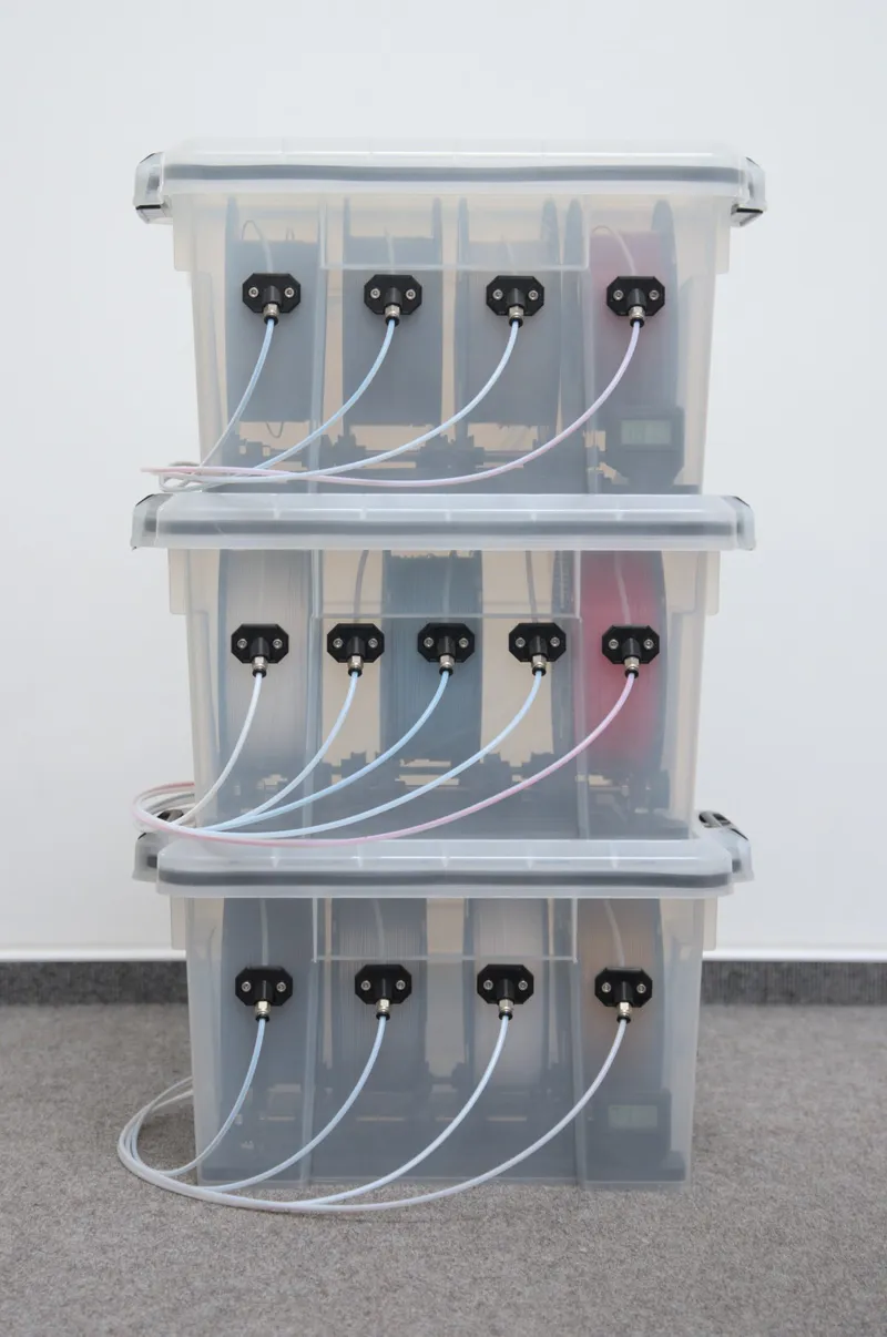 The main feature of this box is that it can be stacked tightly and fit into a 50 cm wide cabinet (outer dimensions). Besides of vertical stacking (picture 1) it can also be stacked one behind another. And as the filament outlets are angled they perfectly support this type of alignment (picture 2 and 3).
