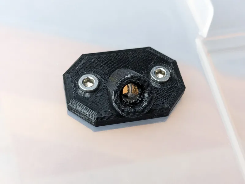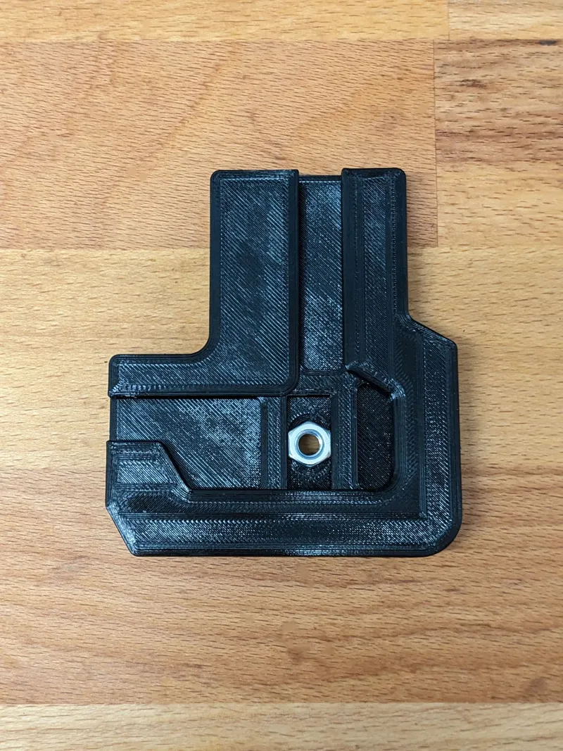 Baseplate: These fit into the corner of the drybox and allow mounting of the brackets for the threaded rods. The base plates compensate for the box's curved bottom and it becomes a rattle and wobble free seat without the need for anything being glued. Type 2 is just the mirrored version of Type 1. You will need two of each type. Print Orientation: Place the top side on the printbed Supports: Manually add some support along the recess for the brackets. If you just bridge these gaps, the mounts will not sit flat and the hygrometer mount will not fit perfectly either. Perimeters: 4 Infill: 30% Required Quantity: 4 (2 of each type)