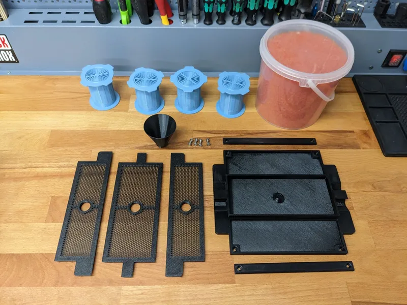 Let your printer do the work and remove the support afterwards. In the meantime, get all the other parts you need. You might also want to check out some additional silica containers that fit into the center of the spools (the ones printed in blue).