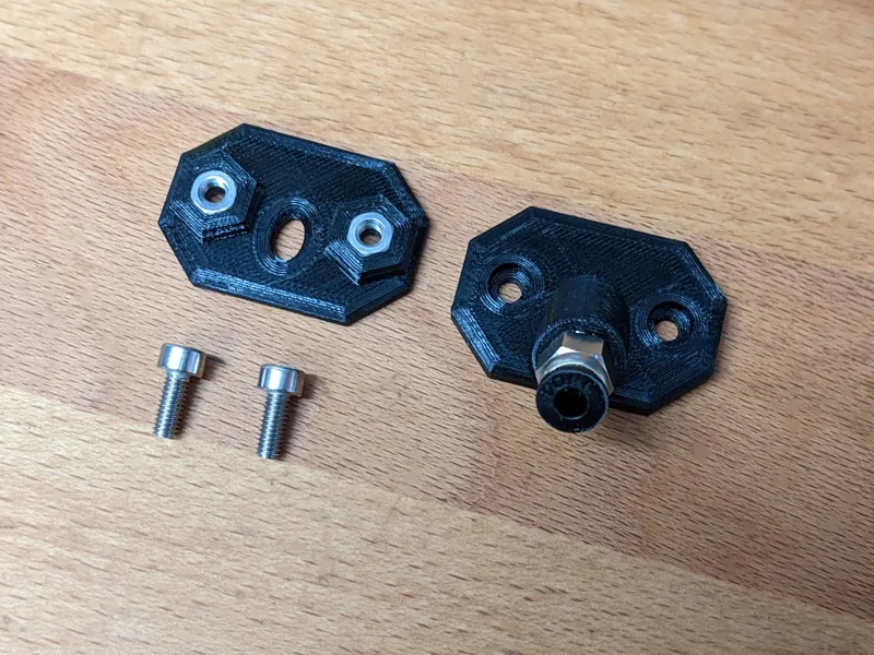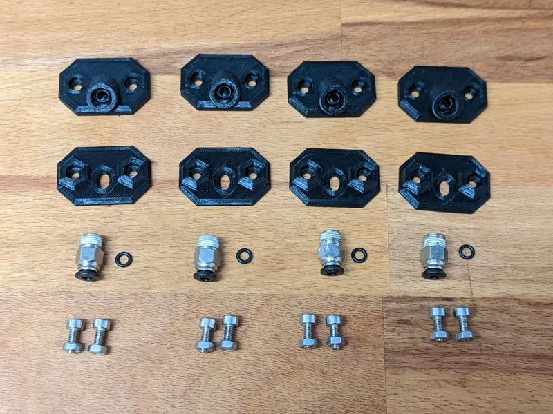 Filament Outlet: The angled filament outlets are (almost) airtight. It also has room for an optional small sealing O-ring to further increase air-tightness Print Orientation: Place the plates it with the flat surface on the printbed Supports: None Perimeters: 6 Infill: 30% Required Quantity: 5 (one will be used as a drilling guide)