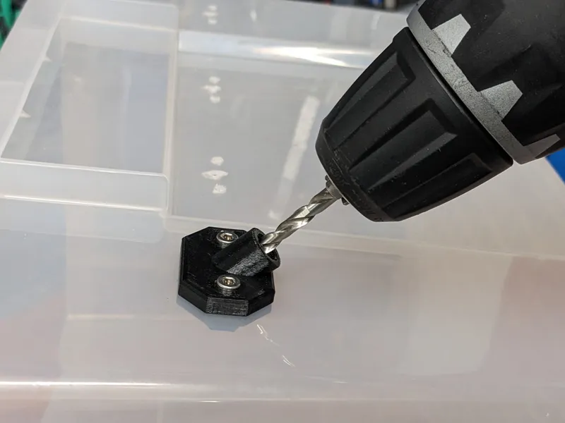 Mount a spare filament outlet as drilling guide and drill the center hole for the PTFE tube (picture 3 and 4). Use a 5mm drill bit.