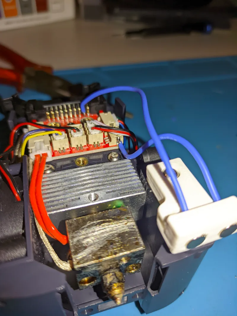 Now, unplug the original inductive probe and don't loose the screw, we'll need it again! Screw the Probe Block into the same hole with the same screw as the original sensor. Now, you'll have to solder. The pictures below show you where to solder the cables and how as well. One end has to go to ground (the one attached to the side of the socket) and the other one onto the “signal” pin, which is on the top, as it was way easier to solder a cable there, than to solder it onto the correct pad at the switch, as there's no real room to work with and by that, you can pretty easily revert to the original sensor as well. But make sure that the cable at the top doesn't stick out too far, as there will be the plate attached above. Also remember to plug all the cables back in! Now, you can reassemble everything.