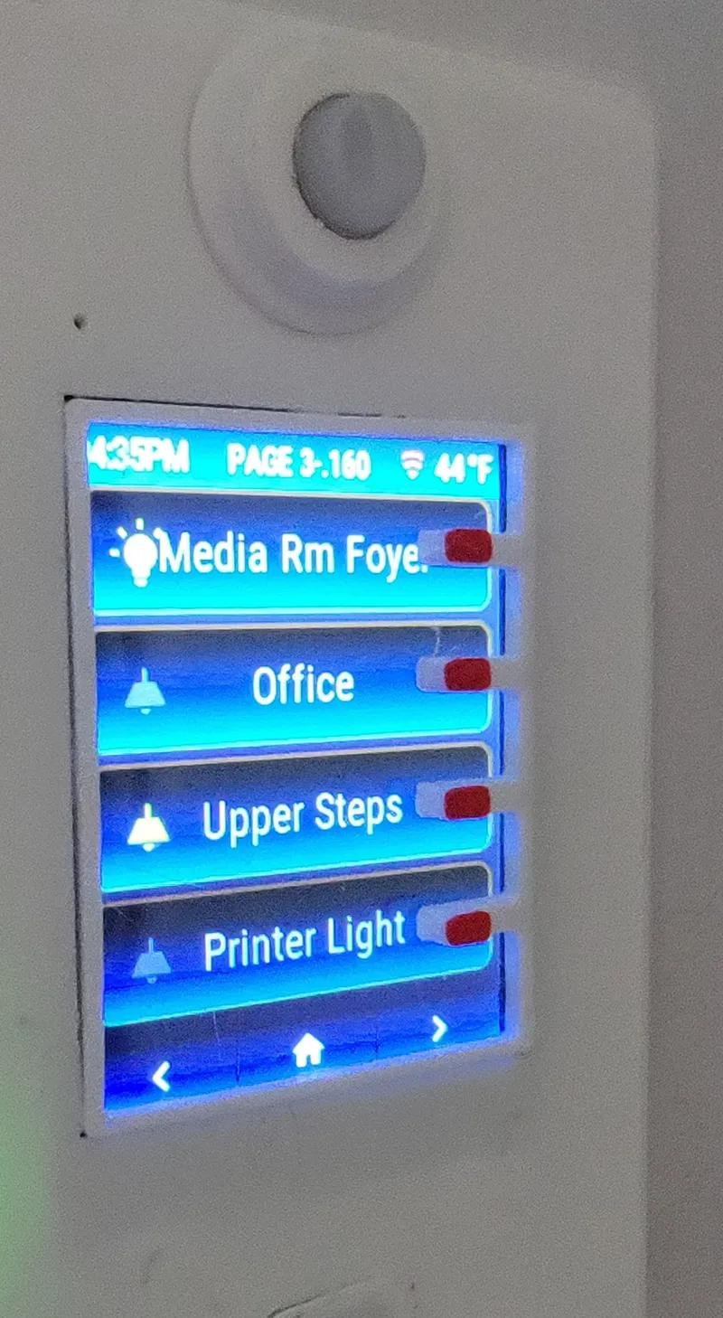 This addon clips into the wall plate just between the touchscreen and the plastic plate. It acts as a tactile switch without interfering with the operation of the touch screen. When programming the openHASP screen, I generally use four horizontal buttons per page as seen in the below photo.